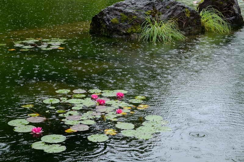 | ハスの葉にも雨粒が… 傘を差しながら庭を歩きます。 |