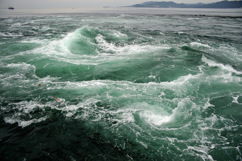 | 水中窓付きの渦潮観測船に乗りました。 狭い海峡を潮が流れることによりうずが出来るわけですが、あっちと思えばこっち、こっちと思ったらあっちと、 どこに出来るか予想もつかず、目(カメラ)ばかり動かしていました。 これも一種の自然の脅威なのでしょうが、この日はかわいらしいうず潮ばかりでした。 (使用機材:Nikon D700/SIGMA24-70mm F2.8) |