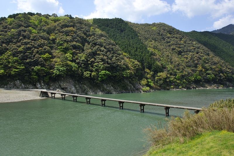 | 最初に現れたのが若井沈下橋。 編集時に調べたら、2014年の台風で橋が壊されて中ほどの部分がなくなってました… 貴重な写真です。 |