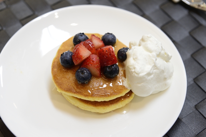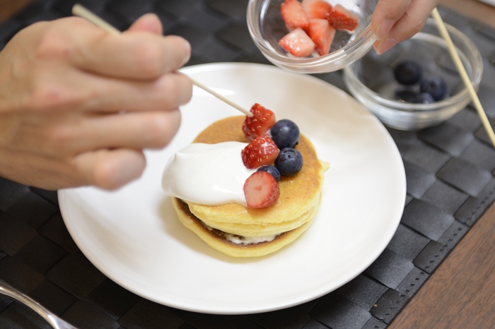 | 焼きあがったパンケーキ(人間の試食用!)に思い思いのトッピングをしていきます。 |