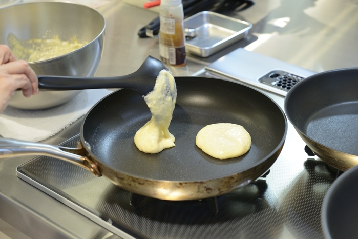 | さっそくパンケーキ作りが始まります。 ふわふわパンケーキのコツはメレンゲを使うこと。 |