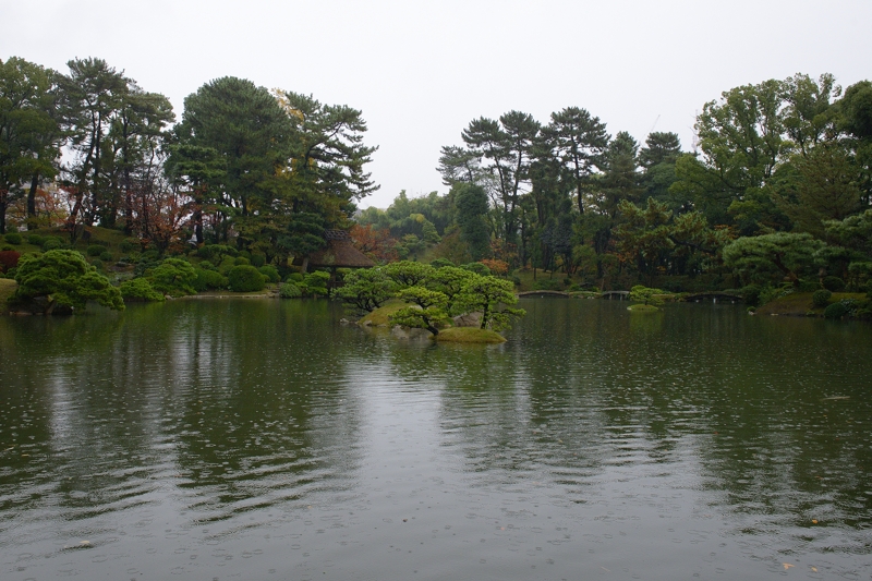| 縮景園に着きました。 いやな予感が当たり、広島は雨。 それも結構降ってます… |