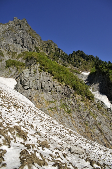 | グリーンシーズンの一ノ倉沢は、山に入るとほどなく沢になってしまい、沢登り用の準備がないと登って行くことができません。 しかし、5月〜6月の限られた時期だけ、雪渓の上を歩いて「滝沢テラス、南稜テラス」の近くまで行くことができます。 簡易アイゼンしか持っていませんが、それでも結構登ることができ、間近に見る岩肌は迫力十分でした。 (Nikon D700/編集&up:2016年4月) |