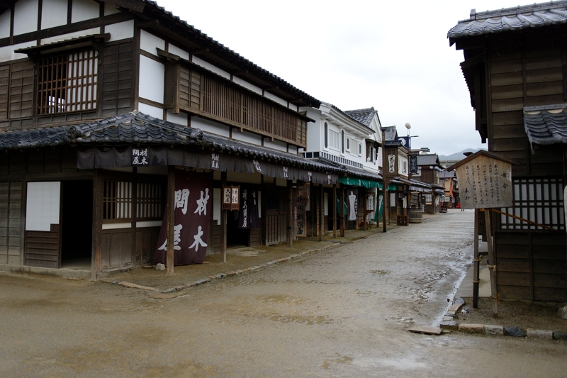 | 嵐山を離れ、東映太秦映画村にやってきました。 江戸の町のオープンセットは自由に歩くことができます。 ここは材木問屋です。 |