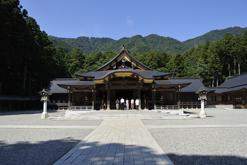 | 社殿と弥彦山。 澄んだ青空に荘厳な社殿がひときわ目立ちます。 |