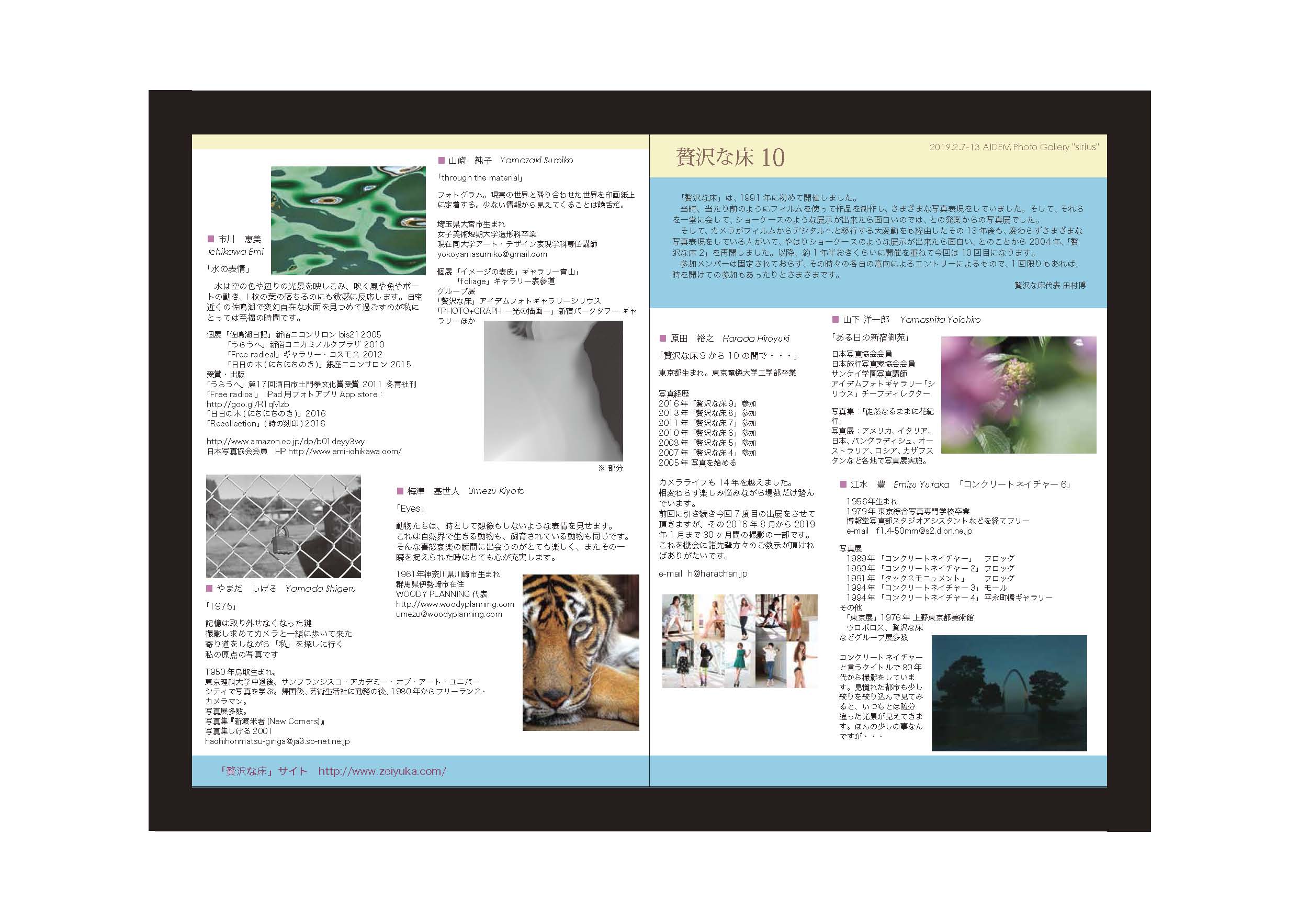 <2019年2月7日(木)〜2月13日(水) アイデムフォトギャラリー「シリウス」> 主催:贅沢な床 会場:アイデムフォトギャラリー「シリウス」 東京都新宿区新宿1-4-10 アイデム本社ビル2階 約2年半ぶりの「贅沢な床」です。 今回は参加者が17名。 私のテーマは「Eyes」(視線)。 いつもと少し違い、笑いあり笑顔あり… 動物たちの様々な表情をご覧下さい。 ※日曜日は休館です。 7日と13日は午後から在廊します。ご来場を心よりお待ちしております。 Reprot & photo / WOODY PLANNING Umezu |